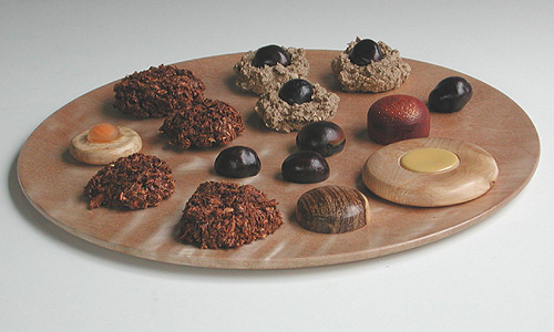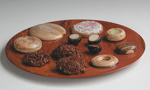 The installation is a collaboration of over 60 top international wood artists who have created place settings, party favors, a birthday cake, party hats, flatware, hot dogs and fries, and any number of other surprises all made of wood and set in a room atmosphere with hand crafted studio furniture.