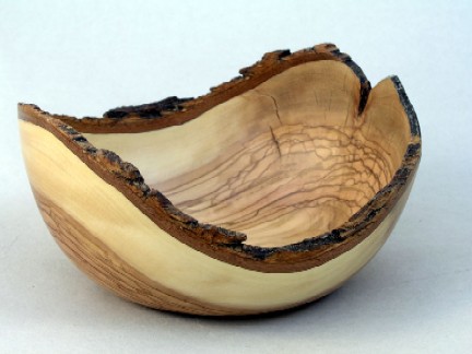 | 05-01-05-Olive_Bowl-02.jpg = Turned May '05. 6-1/4" major diameter by 3" max height, about 3/16" thick. Sanding sealer and wax finish. My second attempt at a natural edge bowl. The first was as Don Comer was showing me how to make my very first bowl (pretty awful!). The wood is from a tree removed from the central hub of Disneyland because it was blocking the view of the Castle! |