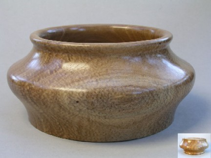| 04-00-05-Black_Locust_Bowl-01.jpg = Turned April '05. 3-1/2" wide, 1-5/8" tall, sanding sealer & wax finish. I thought it was dry wood, but it has deformed 1/8" at the opening. This was nice wood to turn - the first piece I actually purchased as opposed to digging out of the woodpile. I was nervous! | ![]() |