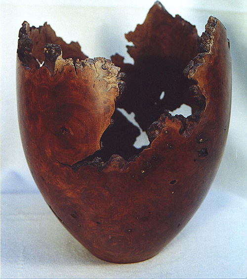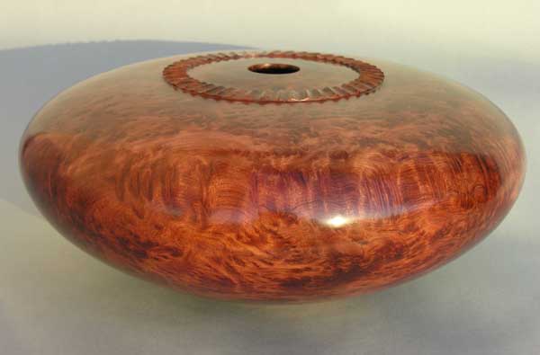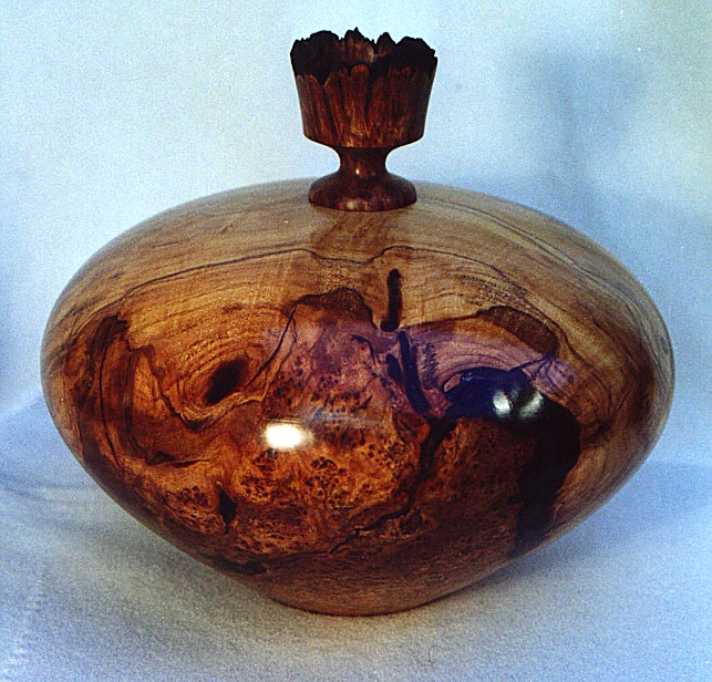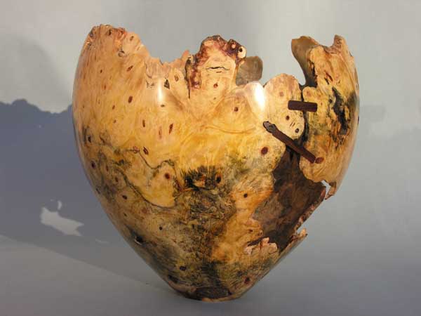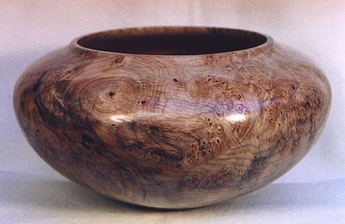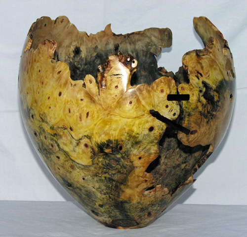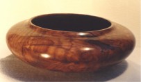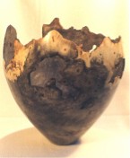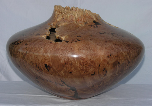 Manzanita natural edge vase. Wood was found washed out of a Southern California canyon after a heavy El Nino storm (8.5” Dia x 10” High). | Maple![]() Polished maple burl enclosed form (12” Dia x 4” High). |