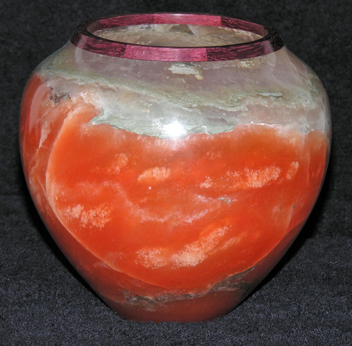 Turned and polished Utah orange alabaster with kingwood rim and foot.