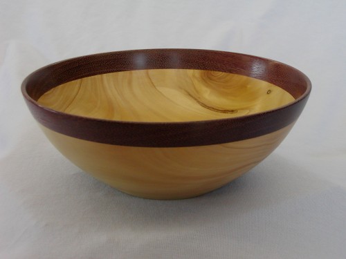 ![]() Italian Cypress Bowl with Purpleheart Rim 7" Diameter x 2.5" Tall, Buffed Wax Finish I like the multiple contrasts in this piece. The Juniper is soft, easily tooled, and has nice figure. The Purpleheart is hard, difficult to cut cleanly, and has little visual appeal other than it's unique color. |