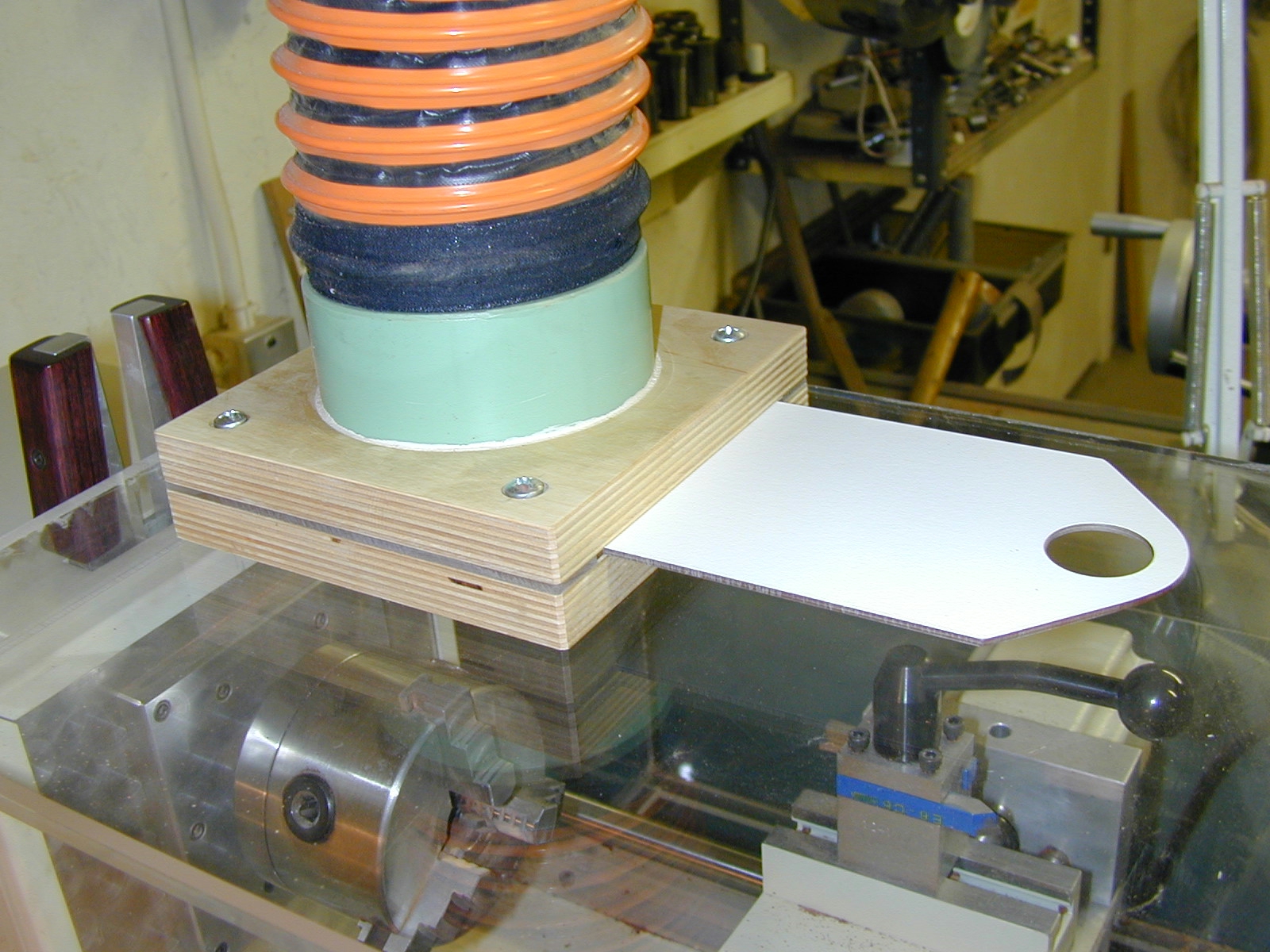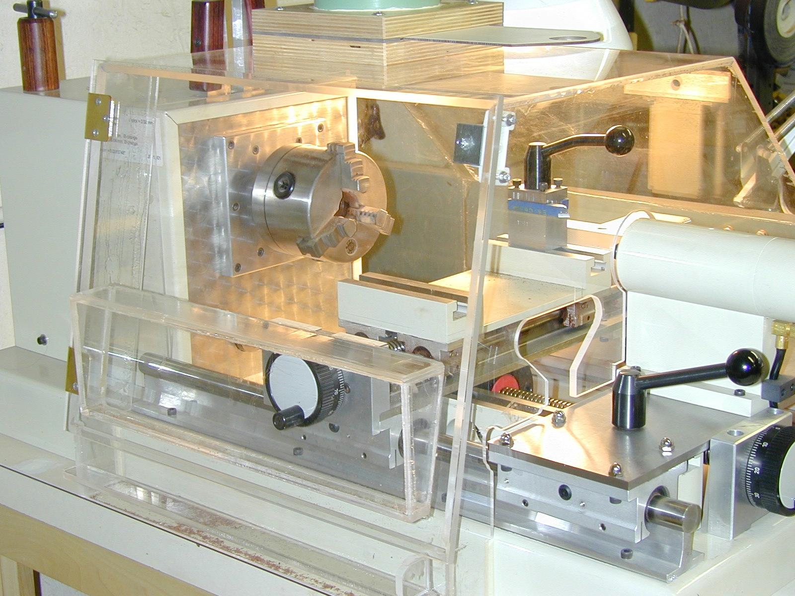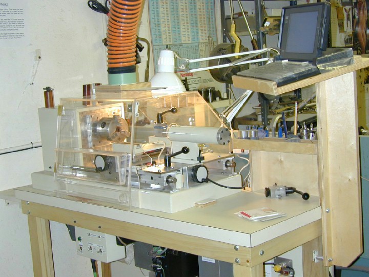 To keep out of trouble with authorities, I began building lathe #2 in '84, and I added a second tool-post to the rear of the carriage in that design, so two differently shaped bits could be brought into action with the same setup. That rear tool-bit is "upside-down" so it cuts the same as the "normal" one on the front, only the backside of the workpiece is moving "up," rather than "down," as it is on the front. The CNC machine is more like a "metal-turning lathe" in that regard: It has fixed tooling, no skews and gouges resting on a tool-rest like "woodturning" is done. And a computer controls where that bit moves about on the spinning workpiece, exactly like a CNC lathe in a machine-parts factory behaves.