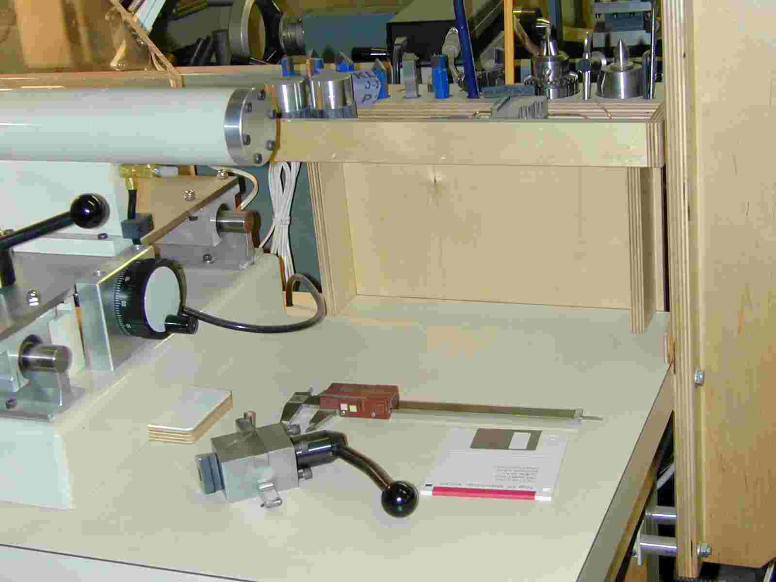 This #2 made 23,000 knobs by '99, and I had by then become infamous in the organ building trade, as I (well, my old PET!) was doing nicer work, faster, for less money per-piece, than the "nearest" competition. And, about that time, the main spindle bearings in ol' #2 began to make untoward sounds as if the end of its life were near. Realizing a sudden shutdown due to exploding bearings would be a) unpleasant, and b) costly to repair in terms of schedule AND money, I decided to try to build a "backup" lathe as fast as possible, hopefully before #2 died.