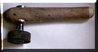 This is a sander made from the handle of a shovel, a Velcro sanding disk and two surplus ball bearings that I had lying around – it works really well. The handle is about 6 inches long (15 cm) oak. The shaft is ¼ inch, the disk diameter is 2 inches. Held at an angle against the inside or outside of a bowl, the rotating bowl (or other object) will cause the disk to spin, thus turning the sand paper against the wood – it quickly removes stubborn scratch marks.